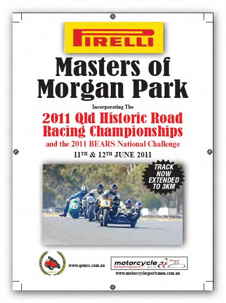QEMSC have recently organised advertising to run in the in the Philip Island race program to promote the 2011 Queensland Historic Titles which will be run in conjunction with the Pirelli Masters of Morgan Park on the 11th & 12th of June. Also ads in the Barry Sheene, Old Bikes Australasia & Just bikes. ( Updated 30/3/2011 )